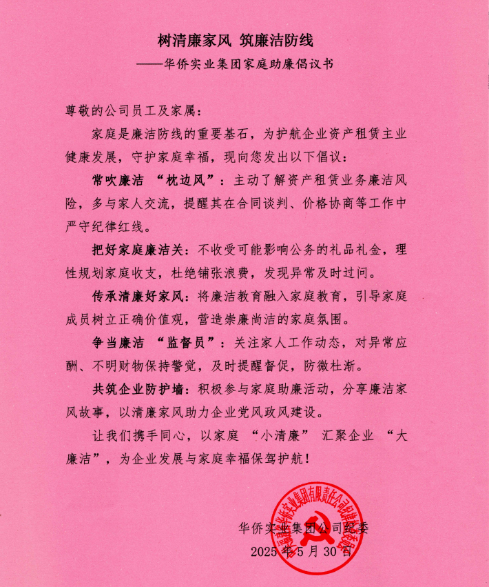 華僑實業集團公司紀委發出家庭助廉倡議書