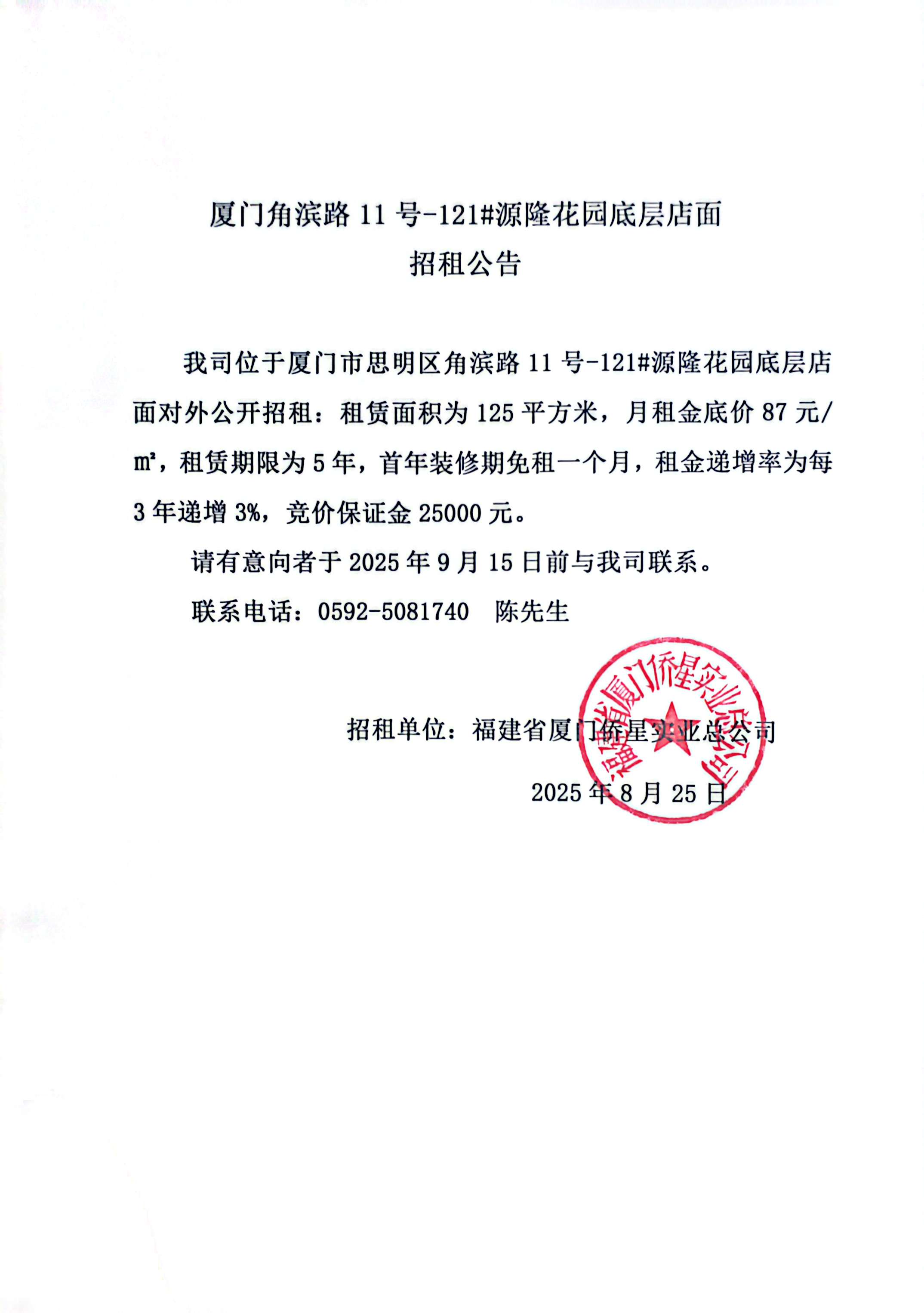 廈門角濱路11號-121#源隆花園底層店面招租公告